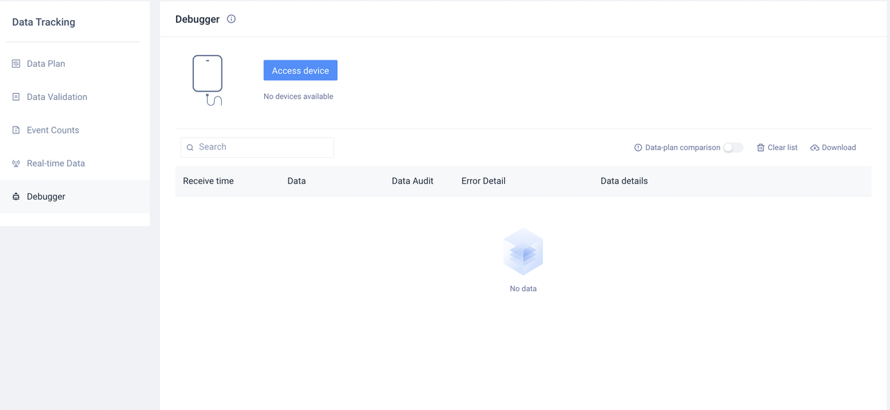 To avoid launching the Debug mode in the production environment, it is required that only specified device can enable Debug mode. The Debug mode can only be enabled for devices whose IDs have been configured in the "Debugger"sector on the "Tracking Management" page of TE when the client side has enabled the Debug mode.